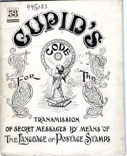 There is always someone, though, who takes matters to extremes. Step forward George Bury who in 1899 devised a code using the position and orientation of stamps. With eight positions and eight orientations, there were sixty-four basic messages, which could be augmented to 128 if two stamps were used. The accompanying pamphlet, Cupid’s Code for the transmission of secret messages by means of the language of postage stamps, included the messages printed in perforated strips and could be re-arranged, giving, he claimed, “close upon 270,000 different ways, so that no attempt to discover any particular combination could possibly succeed”.