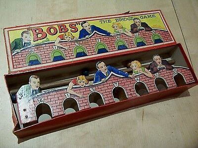 Indoor games manufacturers realised that there was a ready market for an indoor version of a cue and ball game, if they could only develop one that was relatively simple and space efficient. One such that emerged in the early 20th century was Bob’s Bridge Game, which, if the labelling on the top of the box in which it came is to be believed, was “a popular colonial pastime for any number of players”. It is not clear whether this meant that the game originated from one of the outposts of the British Empire or whether those sent to some far-flung outpost of the empire whiled away their hours playing it.