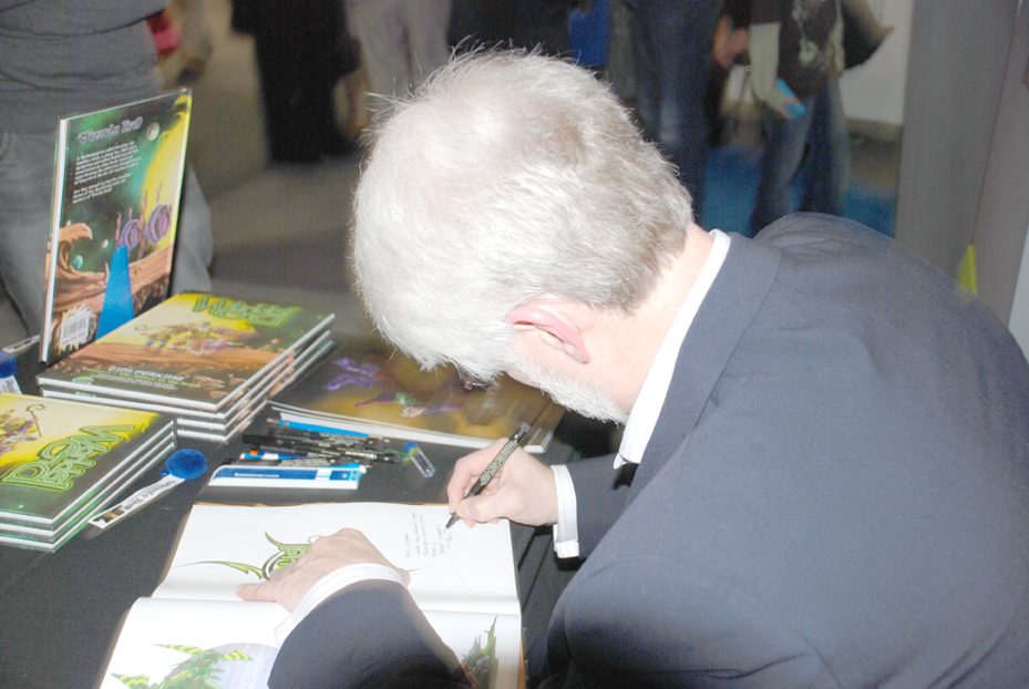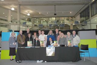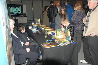 With about five to ten minutes left before the opening there were about six people there, other then the above members of my family and a few close friends. In the background the video played in a loop and seemed to impress folks, as there was always quite a crowd around it. My daughter Joanne sat beside me taking the payments and my neighbour’s son acted as my assistant handing me the accompanying limited edition prints, which I gave away with the initial books. It was amazing to see so many people there and I was glad I had dressed for the occasion in a suit.