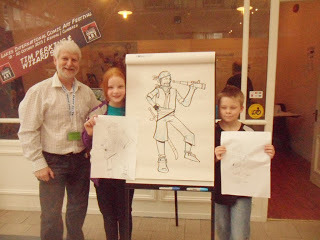 Back at the shop Dave opened up and with a little last minute setting up we awaited the coming crowds. We sketched outside the shop to entice folks towards us, but the crowds were intermittent and for some reason we saw the public were very rarely venturing in our direction. The weather was awful, though, and may have been a contributor to that. By all accounts, however the Comics Clock Tower , in reality the Town Hall, had been seeing a steady influx of people. So it could very well be that the weather was preventing them from venturing far. That said when the public did find us we managed to engage them and during the day we did sell too, albeit slowly. Early on in the morning I had decided that sketching for the children had to replace the expected queues of children that we had hoped to be directed to us and that gave us a chance to engage them and was a lot of fun – it always is.