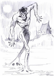 Herein, as promised, a very quick sketch in black Biro that I did in the early hours of this spooky Thursday morning - a little something I have entitled, "The Lurcher from the Bog."