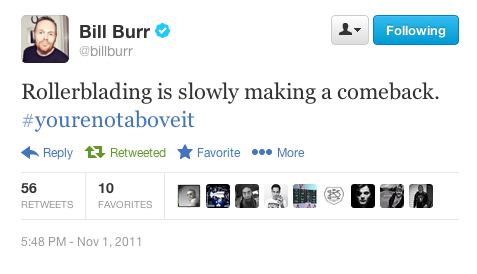 Burr used to play roller hockey in the ’90s until ridicule from other comedic friends forced him to hang up his skates. As a comic, he chooses to make fun of the stereotype instead of supporting it.