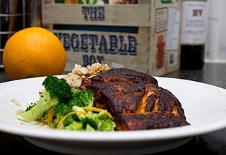 10. Peel orange removing any white rind off of the skin and julienne. Juice entire orange into a saute pan and reduce to a glaze, syrup consistency. Right before it thickens toss blanched broccoli and julienned orange skins into saute pan to marry the flavors.