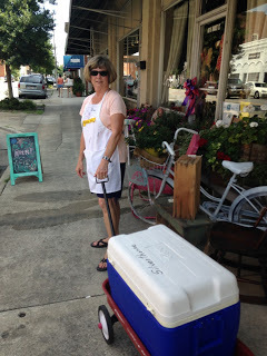 Jackie and I stood in front of the courthouse for about 15 minutes. It was too hot outside for passersby, and apparently too steaming in the courthouse to release anyone. So Jackie and I began strolling around town hauling water in our red wagon.