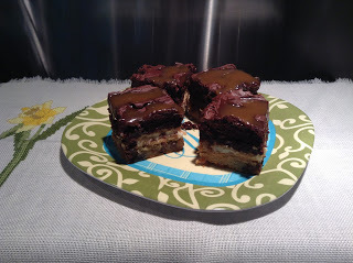 12. Prepare the chocolate ganache layer by melted the chocolate chips and shortening in the microwave for 15 seconds at a time until the chocolate chips are melted. Stir in the heavy cream. Spread on top of the cooled brownie bars. Drizzle caramel sauce on top.