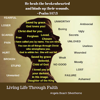 Have patience with me. The beginning is hard. The end is victory in Christ. I pray what Jesus has taught me might help you or someone you know who battles with low self-confidence, depression, addiction, unacceptance, brokenness, hurt, isolation, divorce, loss . . . and the list goes on.