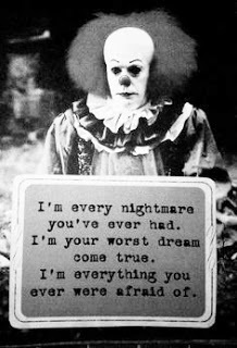 Am I scarred from the gruesome image of that clown? I immediately felt a chill cross my shoulders. Twenty-five years ago it might have taken me into a tailspin, dredging up other things in my life that weren’t going well. Today, I shiver. Then, I name my demon, whether it’s fear, apprehension, anxiety, anger, hurt, etc., and I do not let it take hold of me.