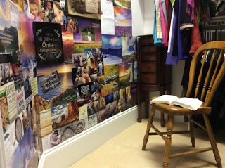 “But when you pray, go into your room, close the door and pray to your Father, who is unseen. Then your Father, who sees what is done in secret, will reward you.” Matthew 6:6When I started my prayer room, I wanted it to reflect my existing prayer life. Colors of God’s glorious creation. Pictures of the family. Snippets of favorite quotes. Art that inspires and motivates me. I want to feel God’s presence when I walk into the room. And I do.
