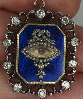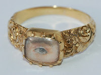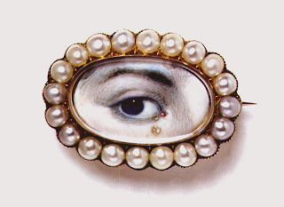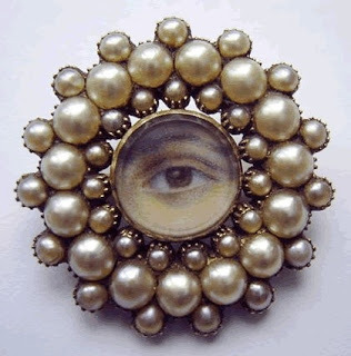 In my upcoming novel, Treasured Lies, two very important clues are found along with a pair of eye portraits. These portraits have an interesting history - the story of their rise in popularity generally stems from the illicit love affair (and secret marriage) of King George IV (when he was Prince of Wales) and Maria Fitzherbert. As he couldn't flaunt a portrait of his secret wife before the court and his politically recognized wife, Princess Caroline, Maria had a miniature portrait painted showing only her eye. This way, George could keep her portrait with him and no one could really say who it was depicting.