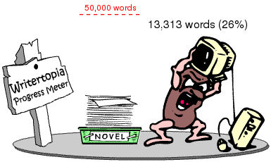 NaNo stats: still behind...working to catch up. Did get 1366 words out yesterday, so a fair showing, though not enough to get me to where I need to be....here's hoping I do better today! :D How is everyone else doing?