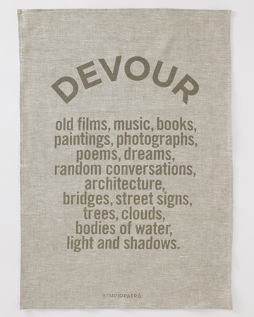 I am in love with these tea towels. Dear friends who came to stay with us at the lake this summer brought the Devour tea towel as a gift, and I hung it, all rumply and lovely, over our fireplace, which is in our kitchen-y/family-room-y area. It makes me happy every time I see it, and I kind of want every single one they make.