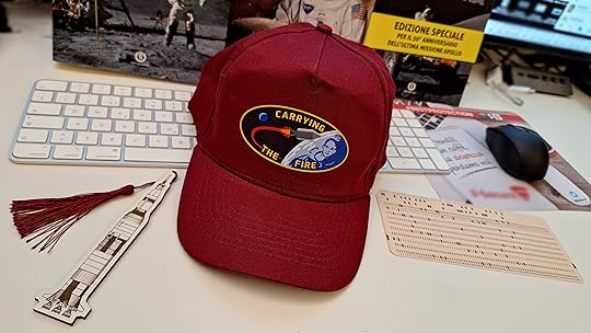 Noterete inoltre che finalmente possiamo svelare i gadget che abbiamo creato esclusivamente per i sostenitori del progetto: il segnalibro a forma di Saturn V, il cappellino con il logo creato appositamente da mio figlio Liam (artista grafico) e la replica di una delle schede perforate usate per caricare il programma di volo nel computer dei veicoli Apollo.