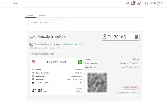 La vignetta adesiva tradizionale, invece, copre il singolo veicolo, per cui anche chi ha le targhe trasferibili si trova a doverne comprare due. Così quest’anno sono passato alla e-vignetta, che ha anche altri pregi: può essere comprata online a qualunque ora e anche dall’estero, evitando quindi ai turisti la perdita di tempo dell’acquisto in frontiera.