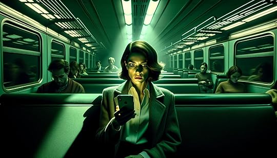 generate a 16:9 photorealistic image of a woman called Dany on a train. She is looking at her Apple mobile phone with an alarmed expression. The train compartment is lit by a cold, greenish light and the mood is foreboding