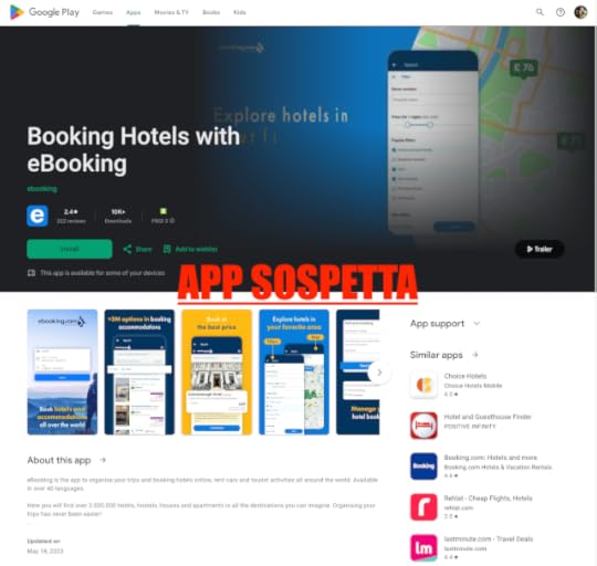 La prima trappola si basa su un equivoco molto facile. Esiste un sito che si chiama Ebooking.com, che non va confuso con Booking.com, senza la E iniziale. Ebooking ha anche un’app nell’App Store di Apple [ho detto “Play Store” nel podcast, scusatemi] e su Google Play per Android, e questo sembra dare credibilità ai suoi servizi, ma ci sono moltissime segnalazioni (Trustpilot, Reddit, Booking, Tripadvisor, Reddit) che lo indicano come fraudolento e citano le lamentele di utenti che hanno prenotato voli e alloggi tramite Ebooking.com, pagandoli in anticipo, per poi scoprire che la prenotazione era inesistente e che il pagamento non sarebbe stato rimborsato.
