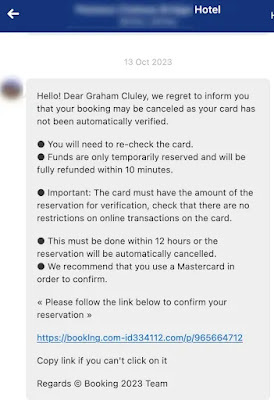 Questo messaggio arriva dall’albergo dove effettivamente è stata fatta la prenotazione e avvisa che quella prenotazione rischia di essere annullata perché la carta di credito del cliente non è stata verificata con successo. Per tentare una nuova verifica si deve cliccare su un link cortesemente fornito, ed è qui che scatta la truffa: il link porta a un sito il cui nome somiglia a quello di Booking.com e che chiede di immettere i dettagli della carta di credito. Se la vittima non se ne accorge, fornisce i dati della sua carta ai malviventi.