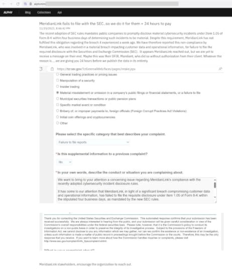 Quello che è meno frequente è che l’informazione alle autorità venga comunicata dai criminali stessi. È quello che è successo il 15 novembre scorso, quando un’organizzazione criminale nota come AlphV ha pubblicato, sul proprio sito nel dark web, una schermata dalla quale risulta che AlphV ha denunciato alle autorità una delle aziende di servizi finanziari che ha attaccato, la californiana MeridianLink, che non avrebbe segnalato alla Securities and Exchange Commission (SEC), l’ente governativo che vigila sulle borse valori, di essere stata attaccata e di aver subìto una fuga di dati.