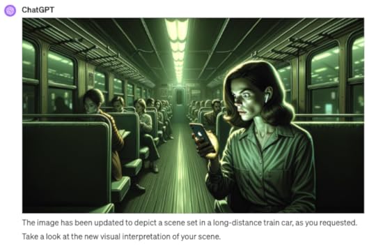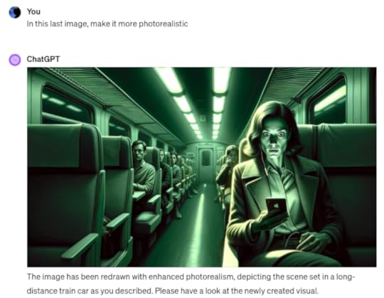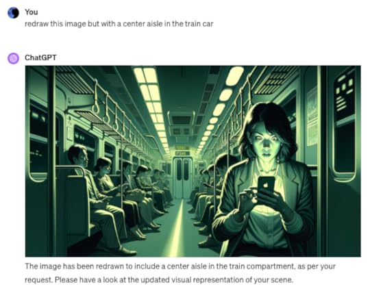 Oggi gli ho chiesto di generare qualche alternativa, visto che alcuni commenti all’articolo originale notavano la mancanza apparente di un corridoio di accesso (c’è, ma è molto spostato sulla destra di chi guarda). Questo è il risultato con la richiesta “redraw this image but with a center aisle in the train car”.