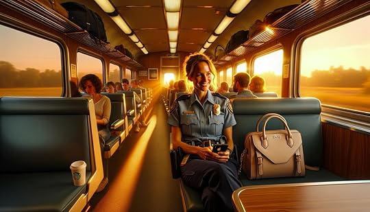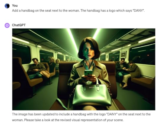 Cambiare stile, umore del soggetto e altri dettagli è altrettanto facile:“regenerate the last image with warm sunlight, at sunset, streaming in from the train windows. The woman is smiling and wearing a police uniform. The logo on the bag must say "DANY"” (è importante ricordargli le scritte, altrimenti sbaglia).