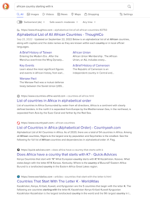 DuckDuckGo, invece, risponde fornendo semplicemente link a elenchi di nomi di paesi africani, dai quali è facile estrarre quello che inizia con la K.
