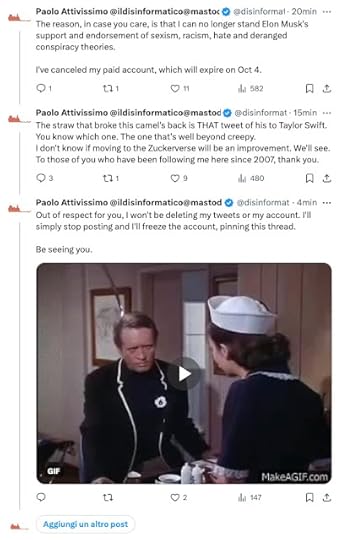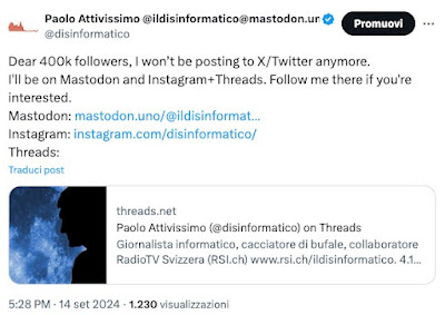 Nel frattempo ho annullato il mio account X/Twitter a pagamento (@disinformatico, aperto nel lontano 2007; resterà attivo per contratto fino al 4 ottobre) e ho smesso definitivamente di postare qualunque cosa su quella piattaforma. Ho motivato a X la mia disdetta così: “I can't stand Elon Musk's support and personal endorsement of sexism, racism, and hate on X/Twitter. The straw that broke this camel's back is THAT tweet of his to Taylor Swift. You know which one”.