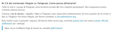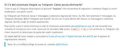 Intorno al 5 settembre scorso le fiere parole di rifiuto di qualunque collaborazione che ho citato prima sono state riscritte sul sito di Telegram. Adesso Telegram non dice più che “Tutte le chat e i gruppi di Telegram sono territorio privato dei loro rispettivi partecipanti” e che non esegue alcuna richiesta relativa ad esse. Al posto di queste parole c’è l’annuncio che “Tutte le app di Telegram dispongono di pulsanti "Segnala” che consentono di segnalare i contenuti illegali ai nostri moderatori, con pochi tocchi.”
