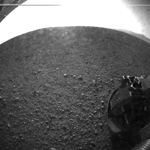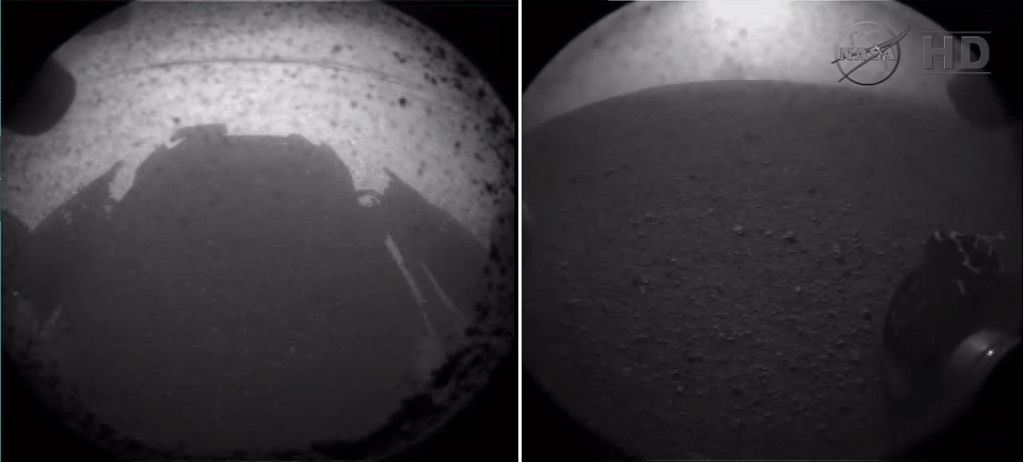 Queste sono le immagini a bassa risoluzione dalle telecamere anteriori e posteriori di Curiosity. Ci dicono che in questo momento c'è su Marte un robot terrestre da 900 chili, dotato di laser capace di vaporizzare la roccia, con un generatore nucleare, atterrato grazie a un paracadute supersonico e una gru volante a razzo che l'ha calato al suolo, dopo un viaggio di 567 milioni di chilometri.