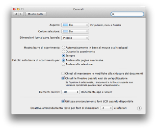 Cosa anche peggiore, la regolazione del font, essendo un'impostazione generale, si applica anche al Finder. Per cui se mi serve un font più grande per il Finder e uno più piccolo per Mail.app, non lo posso avere. Prima si poteva.Scritto da Paolo Attivissimo per il blog Il Disinformatico. Ripubblicabile liberamente se viene inclusa questa dicitura (dettagli). Sono ben accette le donazioni Paypal.