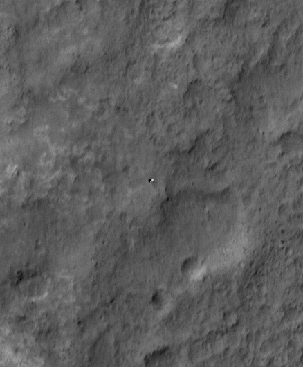 Ieri notte (ora italiana) c'è stata una nuova conferenza stampa per il rilascio di ulteriori immagini da Marte che mostrano le fasi della discesa di Curiosity. Per ora si tratta di versioni a bassa risoluzione perché i sistemi di trasmissione dati da Curiosity non sono ancora stati attivati a pieno regime e quindi la quantità di dati trasmissibile è ridotta. Versioni a risoluzione maggiore arriveranno nei prossimi giorni. Intanto, però, guardate questa foto: