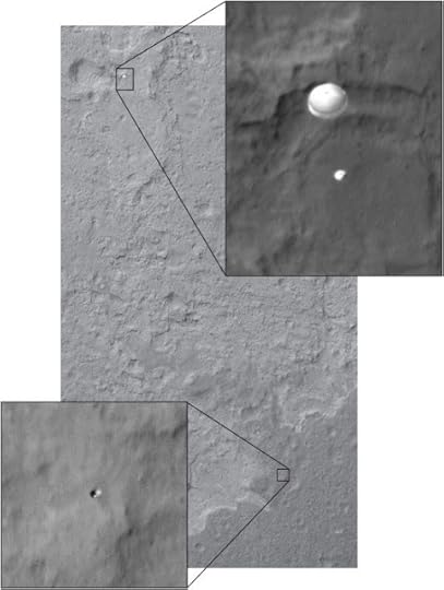 Mostra lo scudo termico di Curiosity, sganciato durante la discesa con paracadute nella tenue atmosfera marziana, visto dalla fotocamera di atterraggio MARDI. Questa fotocamera non è decorativa e la foto non è stata scattata solo perché è cool: lo è, certo, ma ha anche la funzione molto concreta di risolvere il problema della localizzazione precisa di Curiosity sul suolo marziano, indispensabile per decidere da che parte dirigerla quando inizierà a spostarsi e per puntare correttamente le antenne di trasmissione dati verso la Terra.