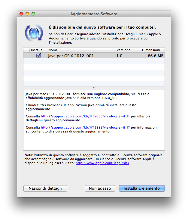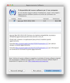 Tramite il menu Aggiornamento Software di OS X potete scaricare e installare l'aggiornamento di Java che risolve la vulnerabilità che consentiva al malware di installarsi scavalcando la password di amministratore sui computer con OS X, come descritto in questo mio articolo.