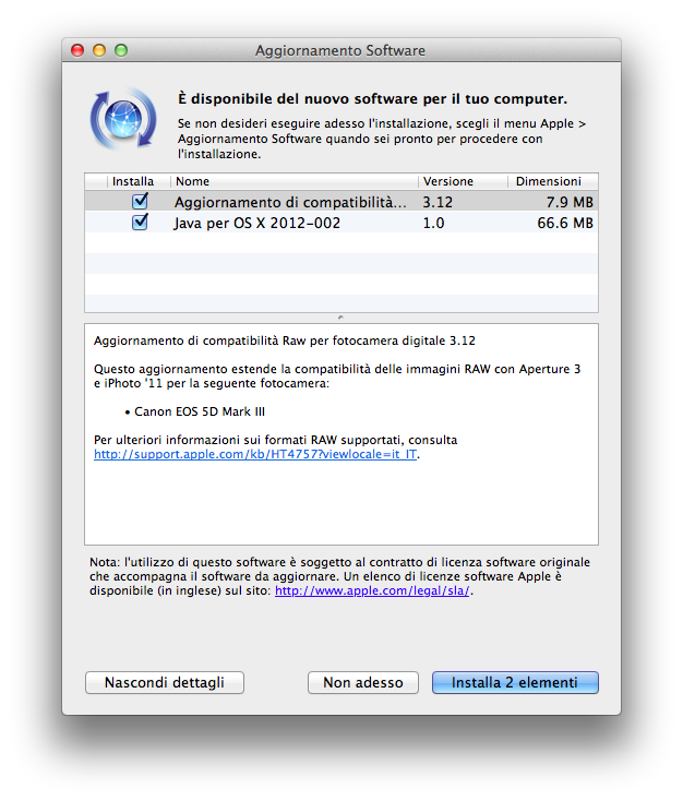L'aggiornamento pesa circa 67 megabyte. Maggiori info di Apple sono disponibili qui e qui. Questo aggiornamento è solo per OS X Lion (10.7); chi usa Snow Leopard (10.6) può scaricare l'aggiornamento da qui oppure usare il menu Aggiornamento Software.