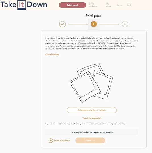 In pratica il servizio di aiuto funziona così: la vittima visita il sito takeitdown.ncmec.org usando un dispositivo sul quale ci sono le immagini che vuole far rimuovere. Lì trova la parola cliccabile Inizia; cliccandoci sopra viene chiesto se la richiesta riguarda immagini di minorenni o di maggiorenni, visto che per i maggiorenni c’è un servizio separato, chiamato StopNCII.org, che funziona allo stesso modo. Fatto questo si può cliccare su Selezionate le foto/i video.
