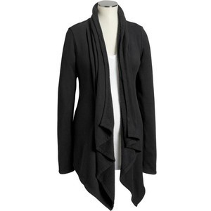 Sweaters: Wide V-neck and cardigans, flat knit, with belt. Avoid fitted, high crewnecks and turltenecks with fitted, foldover necks. Chunky textures add bulk. Other flattering possibilities: soft cowl neck or shawl collar, as long as it’s not bulky; self-belted cardigan. A banded waistline will widen the midsection. (Like a big stripe.) Look for a “handkerchief” hemline–uneven at the bottom. I’ve tried this on. Trust me. Very flattering.