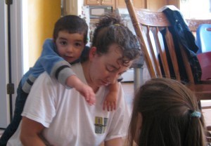 Scene: my nursing chair in the corner of my bedroom, with a baby who can't decide if he wants to eat or play. Nicholas climbs up on the Medela foot stool and leans over top of the baby, who grunts and lets go the breast in order to concentrate on, I don't know, BREATHING. Julianna takes flank position, leaning over the arm rest and putting her weight on my arm–the one trying to support Michael's head at the breast. "Guys!" I say, exasperated. "Back off!" Michael wiggles and laughs.