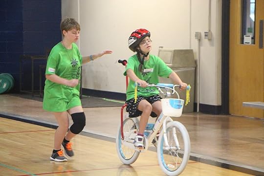 ¾ of the way through Day 3 of iCanBike camp, the gym at the YMCA was starting to get less crowded as the more successful campers started heading outside with their volunteers to transition to independent riding. The speakers were playing “give ‘em hell” music like “Eye of the Tiger” and “How You Like Me Now?”, and at the far end, the head volunteer was trying to coax Miss Julianna, in her Frozen t-shirt and polka-dotted skort, off her roller bike and onto two wheels for the first time this week. She was not enthusiastic about the prospect.