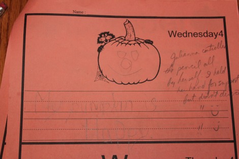 All that to set up a single photo. This is Julianna’s October homework packet. All month she’s been writing single letters, five each: five Ls, five ls, and so on. But this one was different: draw a face on the pumpkin, and write a sentence about it. Julianna asked for help, so I held her hand. But I did not move it for her. I only gave her support and told her what letters to write.