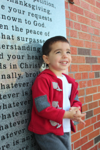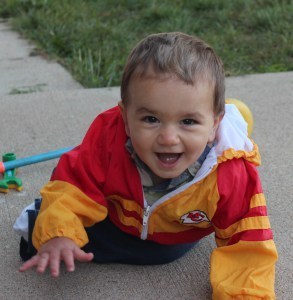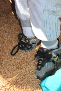 Nicholas standing in a “wheat”-box (instead of “sand”box). Note the inside-out sweatpants. Nicholas’ self-dressing habits should be a post in themselves.