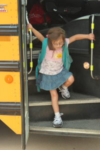 Can you imagine sending a big honkin’ bus like this, so long it needs two stop signs, for a teeny wisp of a girl like mine?
