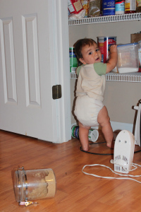 This is my life these days. Note the precarious angle of the sugar canister and the two canisters on the floor. Michael’s four front teeth are coming farther out of his gum every day, and when he smiles it is with a rakish, “My name is trouble” attitude. He’s huge. Christian calls him “Butterball,” and routinely tells people we’re going to have him for Thanksgiving dinner.