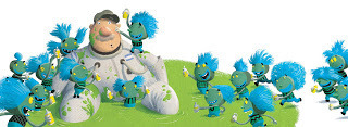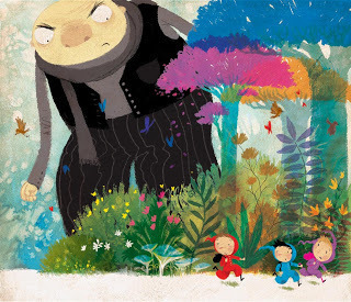 La ilustración Giant Gallumph es parte del libro "The tickle tree" escrito por Chae Strathie y de Meadowside Children´s books (UK), en esta oportunidad la poesía del autor me permitió darle mucho vuelo a las imágenes, ya que el libro trata sobre la imaginación de los chicos, por eso, cuando me tocó dibujar a un gigante lo pensé desde ese mismo punto de vista y desde el mundo cotidiano que lo rodea. Pensé una imágen surrealista pero que tuviera mucho de la visión infantil, es así como el personaje juega! Sostiene a los globos con un cordel, se divierte con un avión o guarda algunos "juguetes" en su bolsillo (un faro, casas, otro avión!)