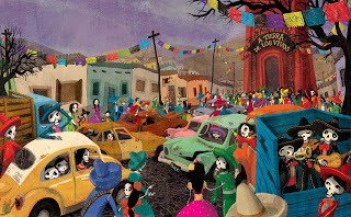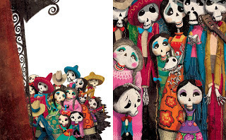 Cuando me dijeron que tenía que ilustrar un libro sobre "el día de los muertos" casi me muero de la alegría... Siempre me maravilló esta festividad por la abundancia de color! Y fue todo un desafío para mi abordar un tema tan difícil, por eso investigué mucho sobre él, descubrí todo un arte maravilloso con una estética llena de simbología y sensibilidad en las costumbres Mexicanas que traté de trasladar a mi trabajo sin perder mi estilo personal y mi interpretación. El colorido, el contraste, la abundancia del blanco y de los negros plenos me ayudaron a profundizar el clima.