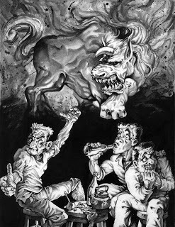 Un domingo por la tarde, mientras tomábamos mate en lo del Guille, le pregunté personalmente si el perro estaba atado; me contestó que sólo lo retenía en una cucha. pero que rara vez se escapaba. Un segundo después sentimos retumbar unas pisadas en el pasillo que va al fondo, acompañadas de un resoplido monstruoso. El Guille, muy alterado, nos pidió que no nos moviéramos. El perro estaba en la casa. Estábamos helados. E. Nono temblaba como un motor en marcha. víctima de sus propias fabulaciones. Lo vimos salir al pasillo y oíamos que le gritaba y lo mandaba a cucha; al parecer el perro no tenía intenciones de volver, porque el Guille parecía cada vez más furioso.Entró a la cocina, y luego de hechamos una mirada extraviada. tomo un látigo que colgaba de la puerta y salió a enfrentarse con el minotauro.