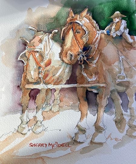 You have time to really get to know a photo by painting it. Taking the time to really observe by looking at details and the position of the horses heads makes the photo come to life. When it’s tied to your grandfather that you never knew, it draws you closer to him. You wonder the experiences he had with the plow and the land, his boot steps in the newly turned crust. The sound of leather thrown on quivering backs of pure muscled horse. Horseshoes left in the dirt to be found years later and treasured in an Artist studio. Painting the past brings the past to life and bridges the gap to tie you to those who have left footsteps before you.