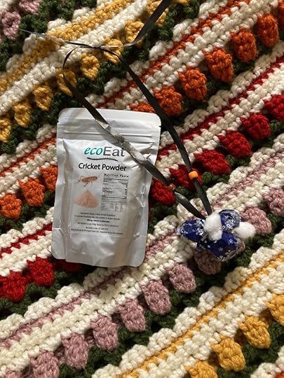 The ingredients for the Cricket Powder reads House Crickets. You can’t eat it if you’re allergic to crustaceans. It came with a note from Jiminy that said, “Don’t let me die in vain”. That’s what you get for Christmas if you have 5 sons. The ornament is a hand made gift from a grand daughter. So is the beautiful handmade afghan which another grand daughter finished up while at my house and whenever I came accidentally into the same room, she would bend over at the waste to hide the unfinished gift.