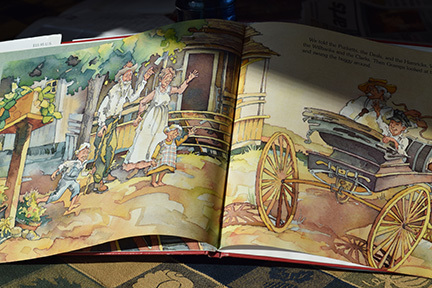 Yesterday there was a knock on my door. I ran down to answer it. The Gibbons’ were standing on our porch. I gave Faye and her husband a big hug. Though we had never met, they felt like old dear friends. They had made the long journey from Alabama to Utah. We chatted over Chicken Pot Pie and French Bread, corn on the cob and garden tomatoes. They entertained my family with tales of times past in the Georgia mountains. Faye gave me a hand crocheted scarf. When I illustrated “Full Steam Ahead”, Faye had sent me a photo of some of her relatives if I wanted to use it in the book. It worked in perfectly. Yesterday I gave her that illustration from the book.
