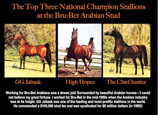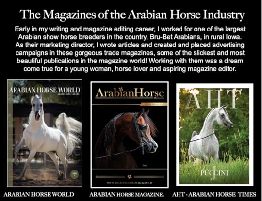 I had just graduated with a Master's in Journalism at the University of Iowa and went home to rural Iowa to help my mother take care of my dying grandmother. I was lucky to find one of the coolest jobs on the planet amidst the rural cornfields of Iowa; I became the marketing director for one of the leading Arabian Horse Farms in the world, Bru-Bet Arabians, during a time when the Arabian industry was on fire. I couldn't believe my luck! I'd grown up with horses, had them and ridden them all my life, and was even a rodeo queen. And I loved Arabian horses!