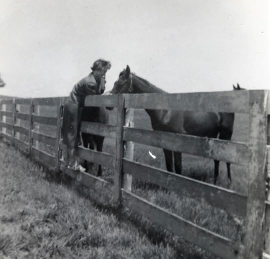 When I was one-year-old, my parents and my grandmother visited Calumet Farms in Kentucky, and I got to pet the Triple Crown winner, War Admiral, son of the iconic Man o 'War. I fed him grass too. My mother took a picture of my dad holding me while I reached out to War Admiral. Sadly, that black-and-white photograph taken with my Mother's Brownie camera has been lost. It was one of my most precious possessions. But I do still have a picture of my mother, Dorothy Hufford, at Calument Farm petting War Admiral and his pasture mates in 1955 (above).