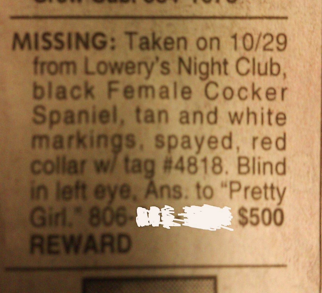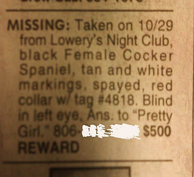 3) Why when describing a lost pet would you bother to include spayed? These ads cost by the word and given the fact that with some exploratory probing a person can not verify this information gotta say this was a wasted dime. If I;m going to waste cash by tossing in an extra word I;m gonna get my money;s worth and use something fun like onamonapia. Oh come on, don;t act like you enjoy the way onamonapia whishes off the tongue.