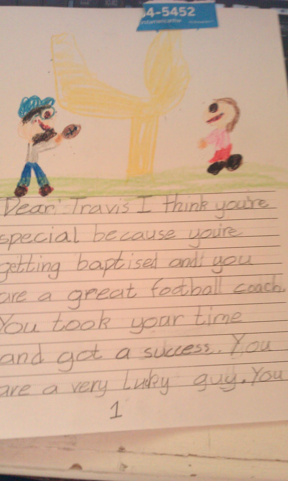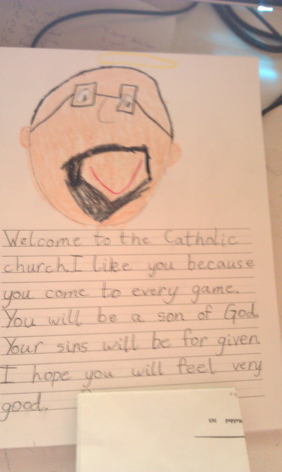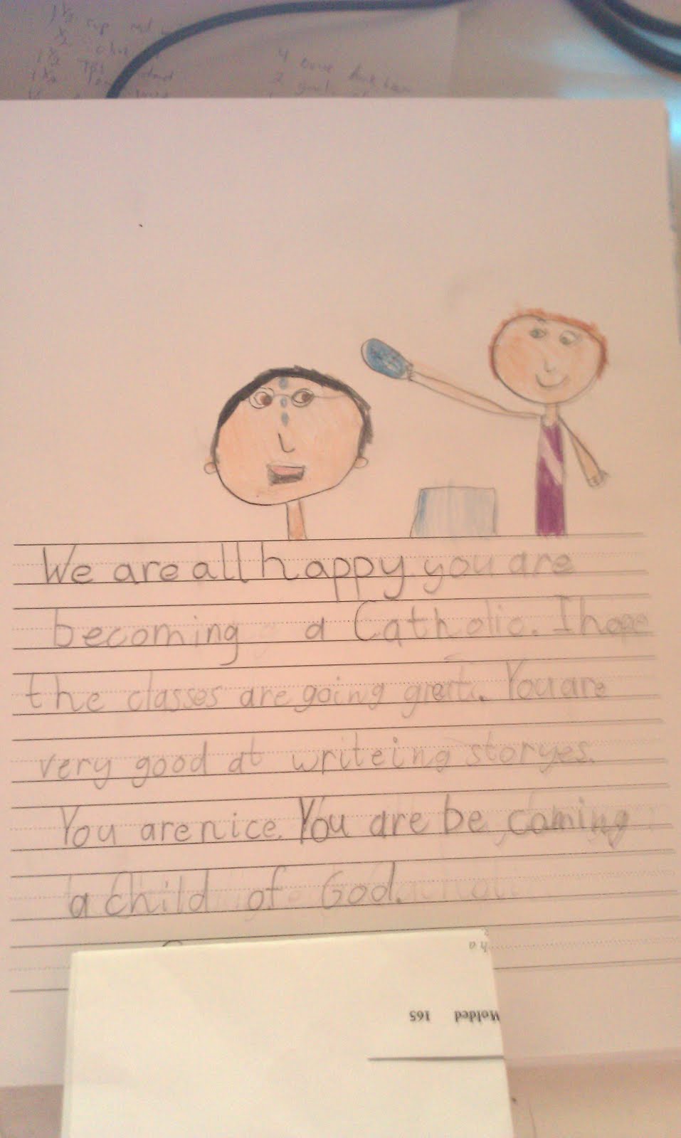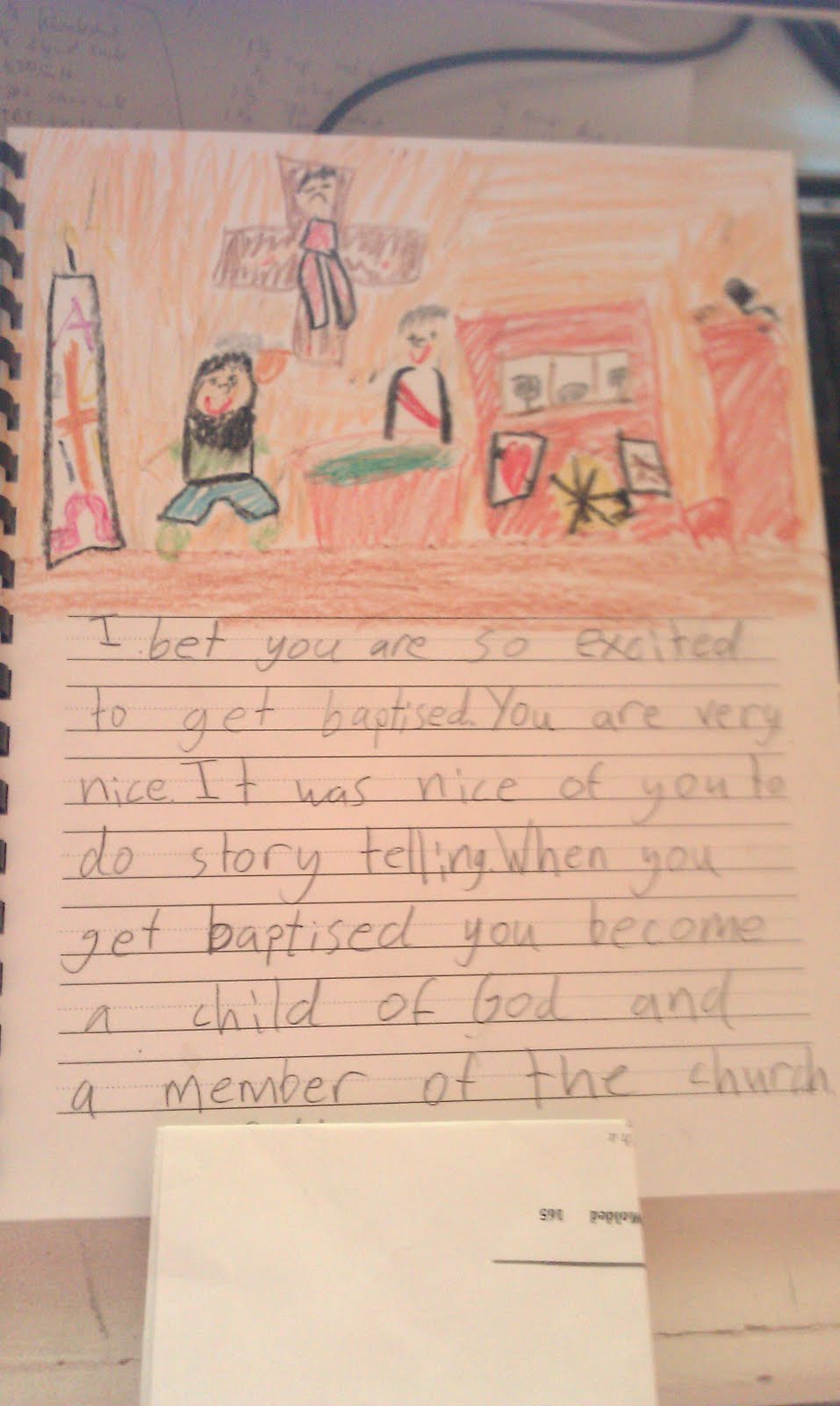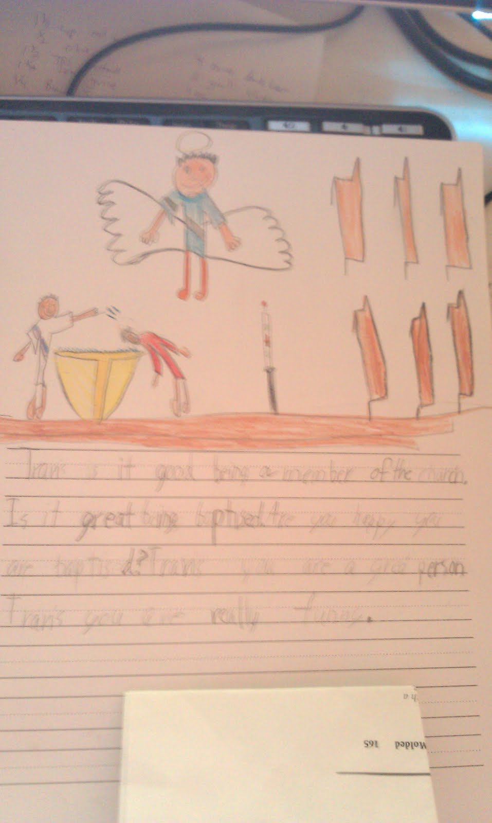 And yet I never expected to be overwhelmed with the gift the 2nd grade class gave me in honor of my upcoming baptism. the kids made me a book and despite this post already being long. I'm going to share the pages of that book as well as my comments. I'm not sure what a cockle even is, but this unexpected gift sure gave me the warm fuzzies.